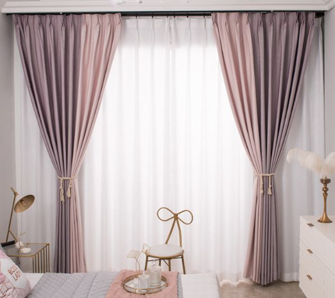 浅灰+粉色:浅灰色独有一种优雅自持的韵味,在色彩中它通常代表理性与安静,搭配粉色的窗帘营造出温柔演绎撩人的优雅与浪漫。